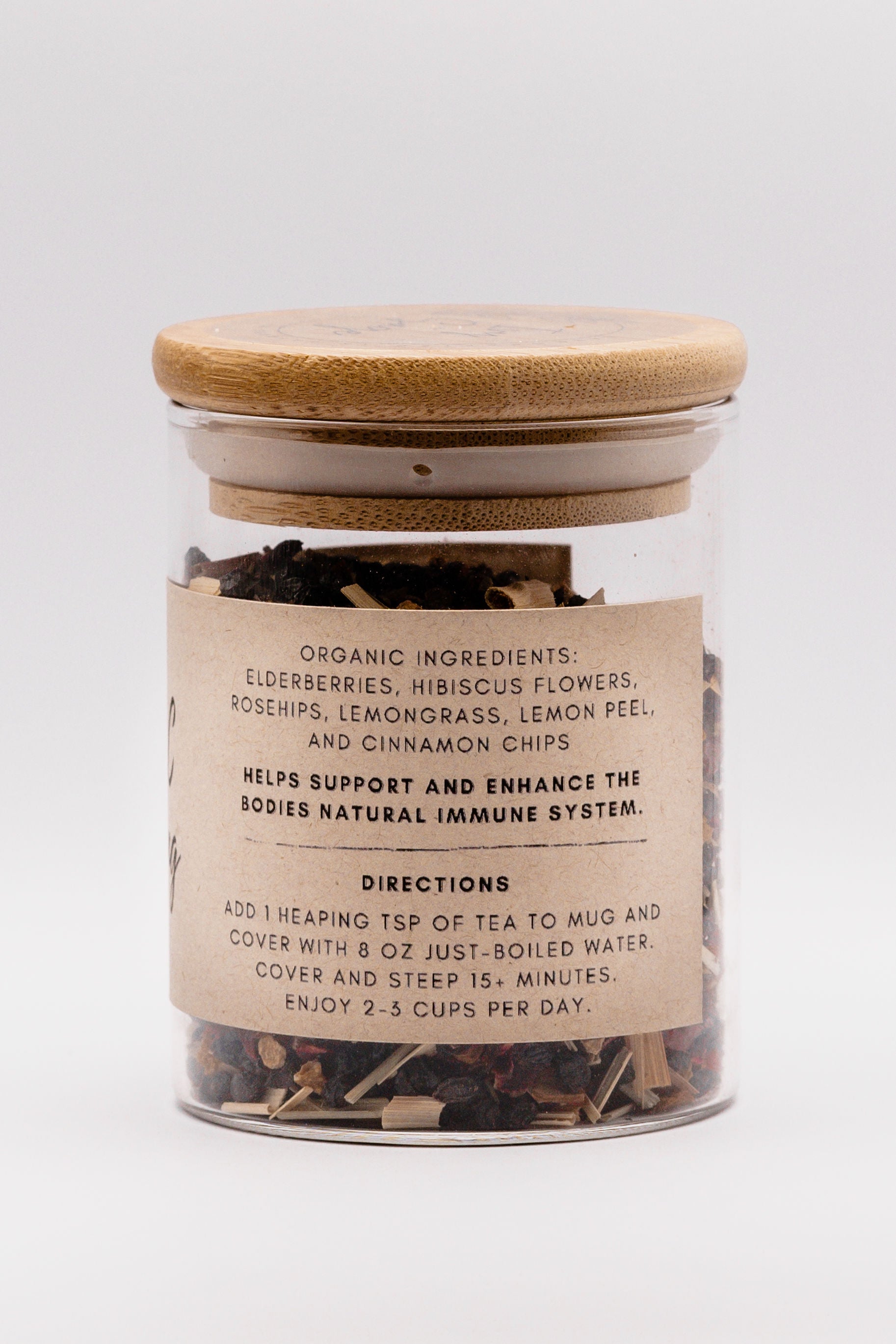 A wonderful blend of high-quality organic herbs make up this tea. Elderberries, Hibiscus Flowers, Rosehips, Lemongrass. Lemon Peel and Cinnamon Chips. Steep a heaping tsp of tea in 8 oz of water for 15+ minutes. Enjoy 2-3 cups per day. 2.8 oz of loose leaf tea. Makes about 20 cups of tea.